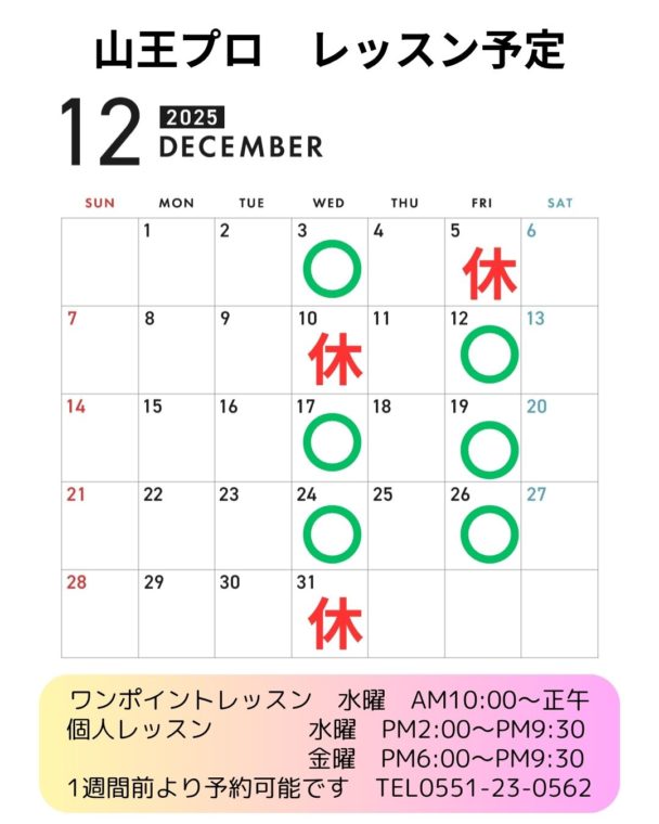 12月より冬季時間での営業になりますのでレッスンの最終受付がPM9:00となりますのでご注意ください。